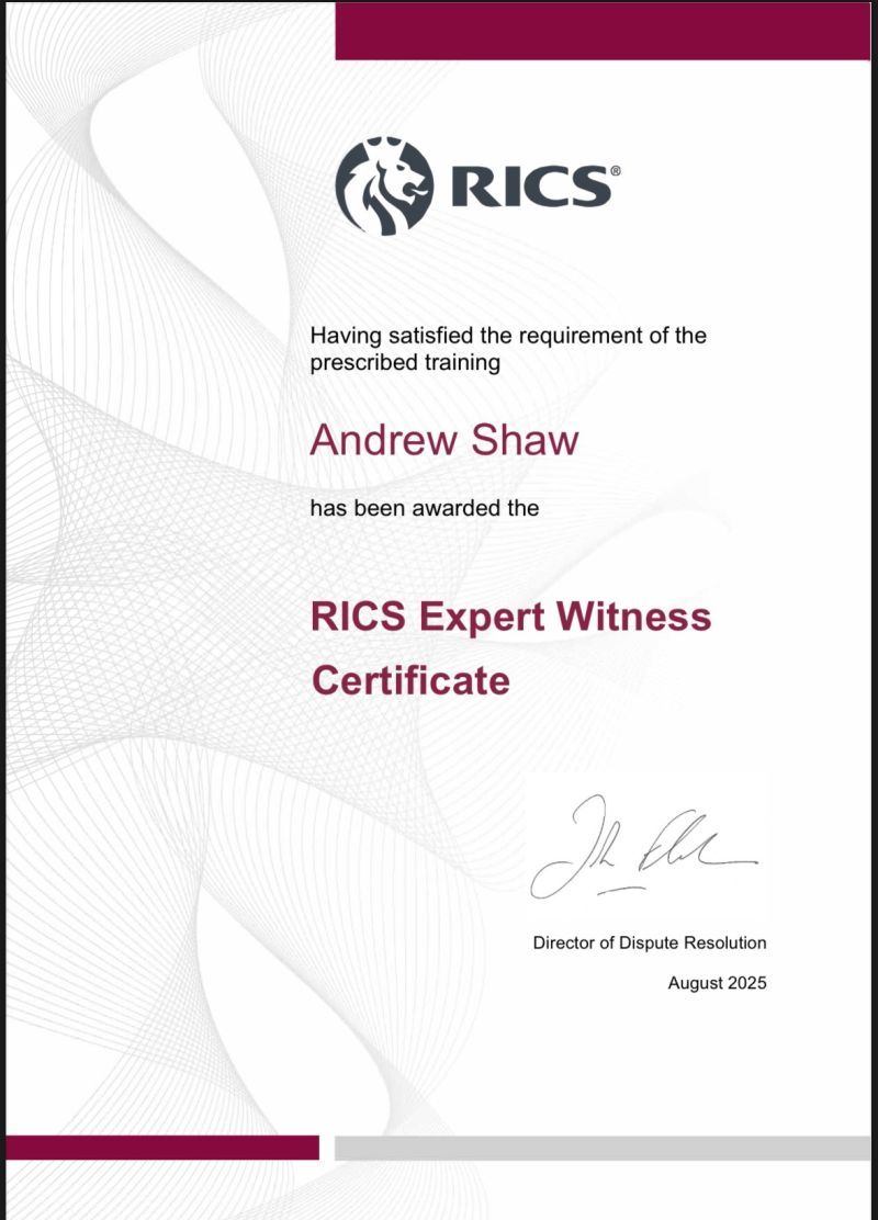 We are proud to announce that Andrew Shaw, Commercial Manager, has successfully completed the RICS Expert Witness Certificate a programme designed to equip professionals with the essential skills and knowledge required to serve as credible expert witnesses in legal and tribunal proceedings.